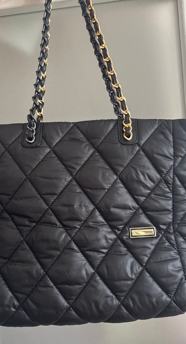 Siyah deri kadın çanta, zincir detayları ve kapitone desenleri vardir