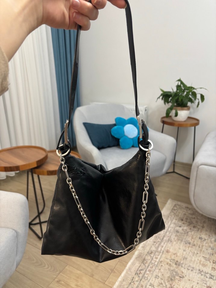 Mango ğZincir detaylı siyah deri kadın çantası. Desensiz, şık tasarımıyla günlük rahat sokak stiline uygundur.