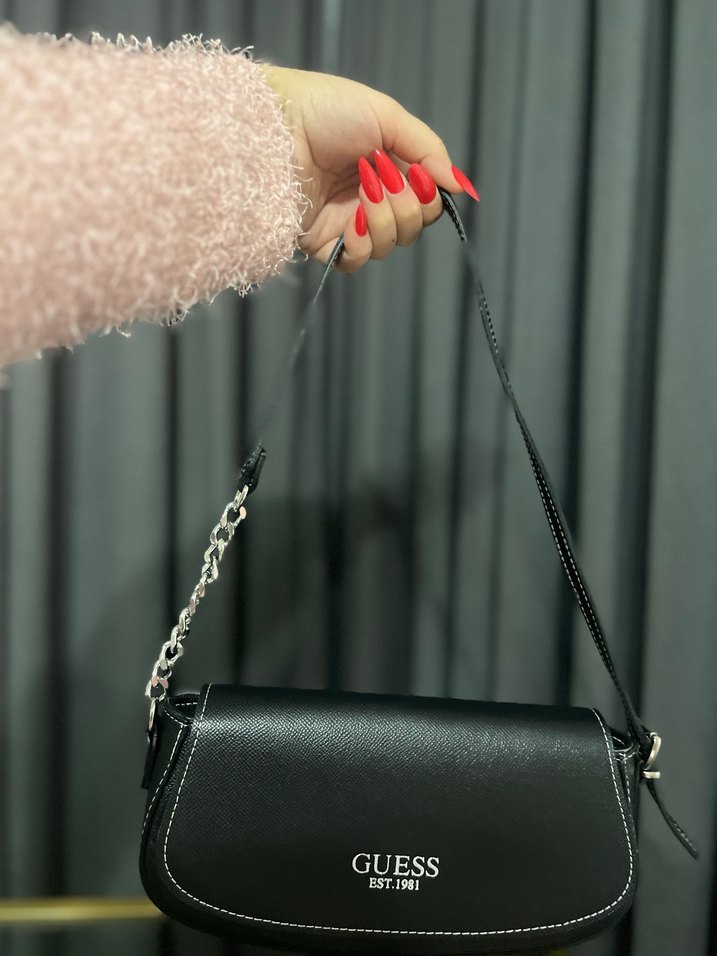 GUESS markalı, zincir detaylı siyah deri kadın çantası. Minimalist ve şık tasarımıyla günlük kullanıma uygun.