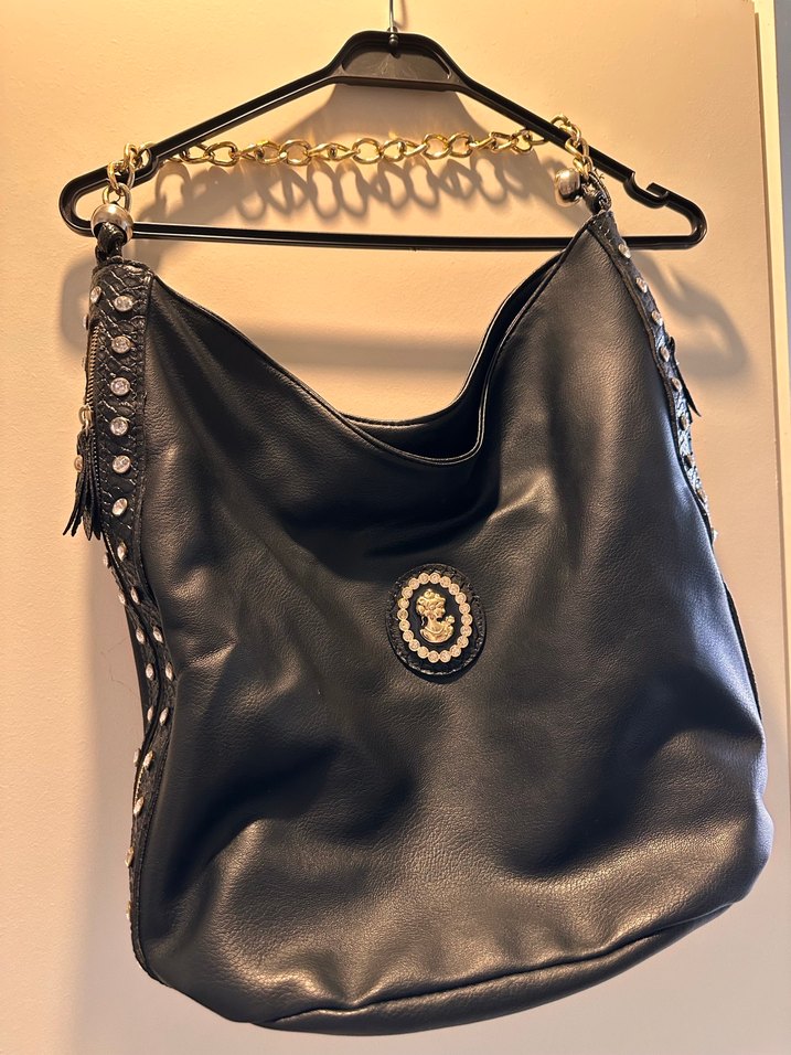 Zincir saplı, baskılı detaylara sahip siyah deri kadın çantası, parlak gotik tarzıyla Paris etkisini günlük kullanıma sunar.