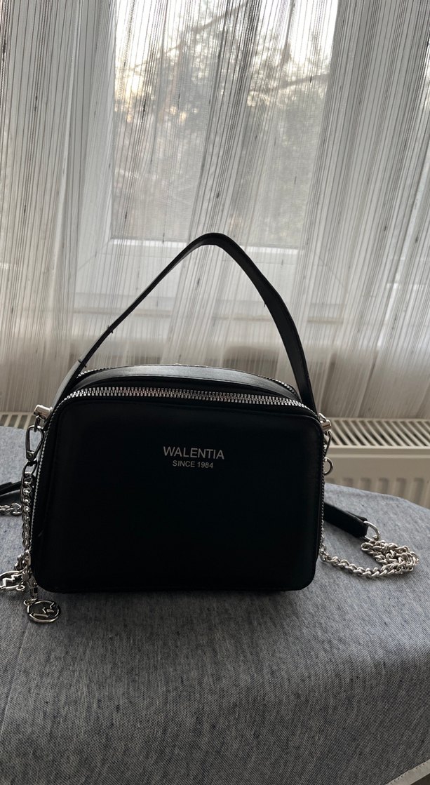 Zincir detaylı, baskılı siyah deri kadın çantası. Günlük kullanıma uygun, trend goth sokak stiline uyumlu.