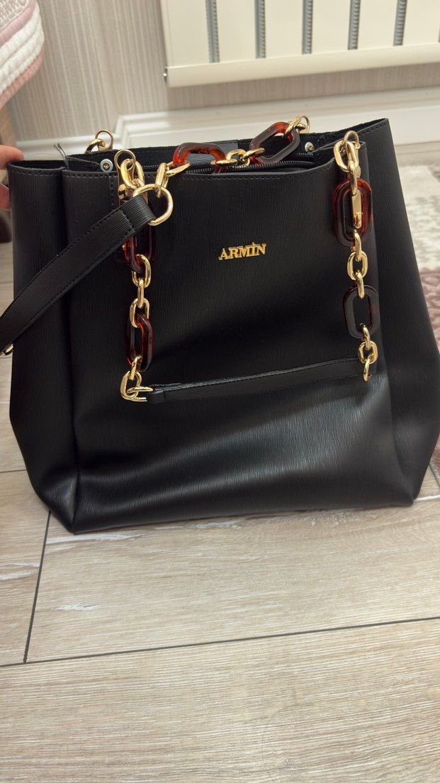 Parlak siyah deri çanta, zincir detayları ve baskılı desenle klasik şıklığı bohem tarzla buluşturuyor. Önünde "ARMINE" yazısı bulunur. Günlük kullanıma uygun.