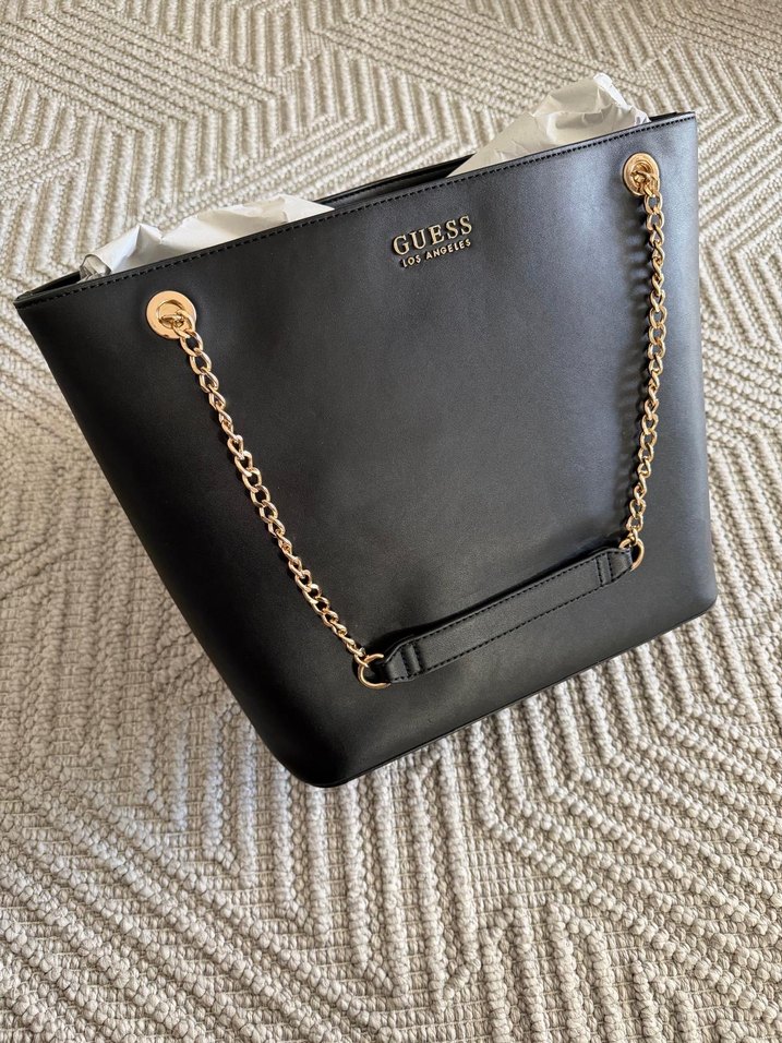 Siyah deri kadın çanta, zincir detaylı ve baskılı logo ile. Parlak yüzeyi günlük kullanıma şıklık katıyor. ✨son fotograftaki gibi zincirden kaynakli bir iz var ona gore degerlendirin lutfen