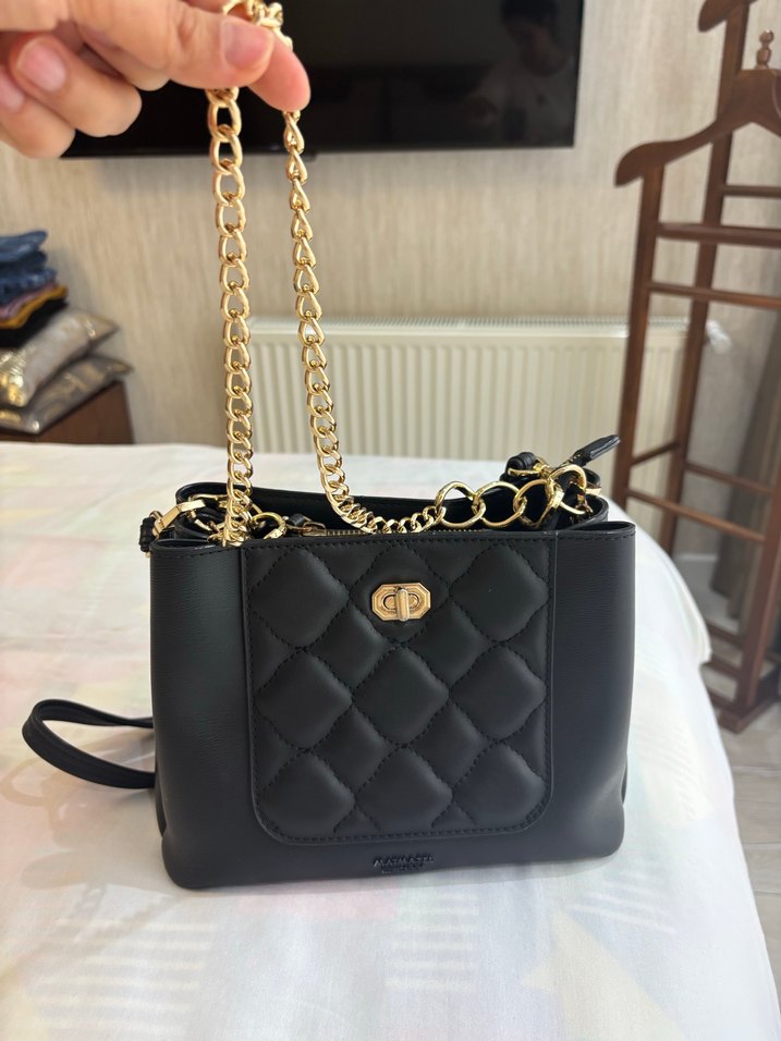 Zincir detaylı siyah deri kadın çanta, modern klasik tarzı Paris şıklığıyla birleştirir ve günlük kullanıma uygundur.