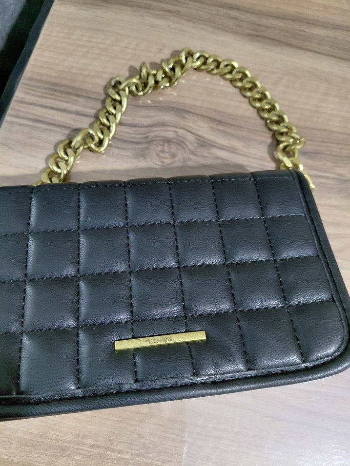 Bu siyah deri kadın çanta, kareli desene ve altın renk zincir detayına sahip, Paris sokak modası ve trend günlük stilini birleştiriyor.