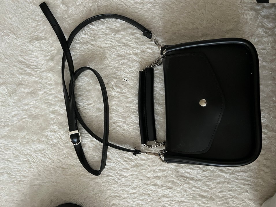 Zincir detaylı siyah deri çanta, desen içermeyen şık tasarımıyla günlük kullanıma uygundur. Klasik zarafet ve gotik tarzı yansıtır.