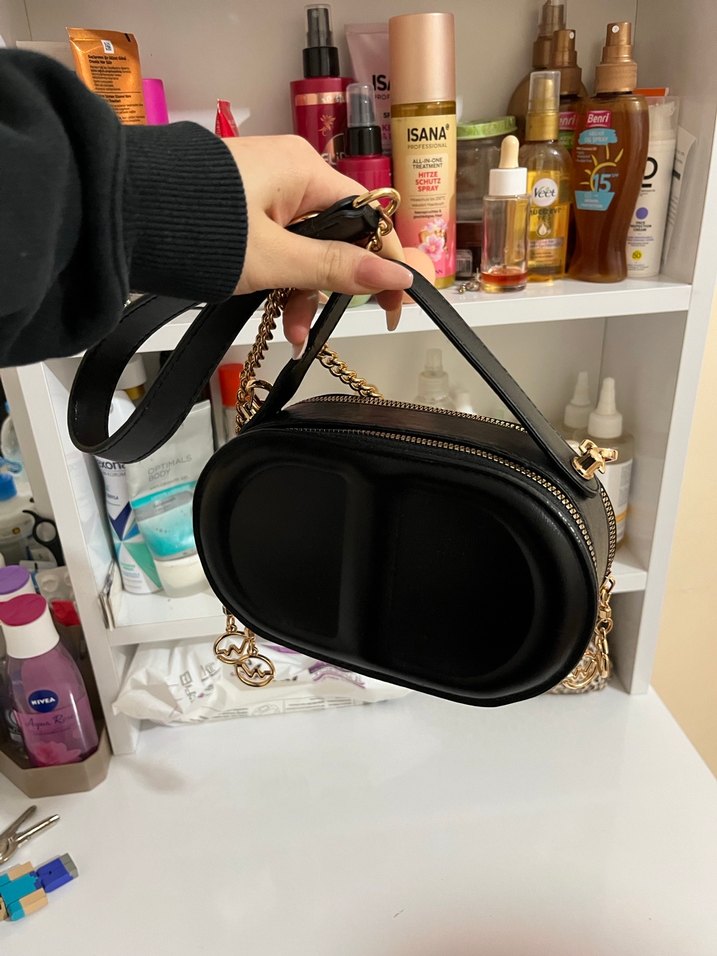Zincir detaylı, baskılı siyah deri kadın çantası, cesur sokak stiliyle günlük kullanım için uygundur..
