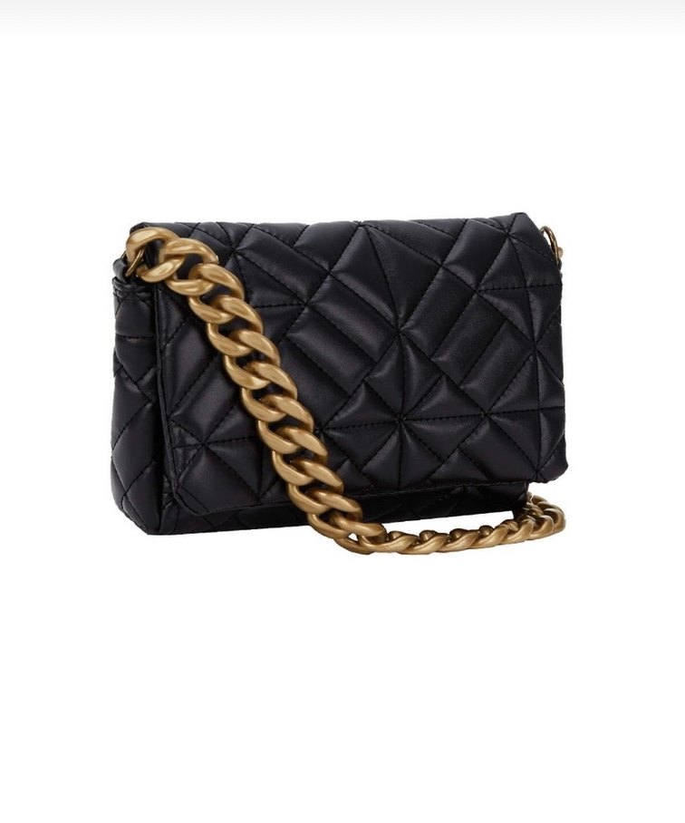 Siyah deri, kapitone desenli kadın çantası, belirgin altın renkli zincir detayıyla trend sokak stiline uygun.