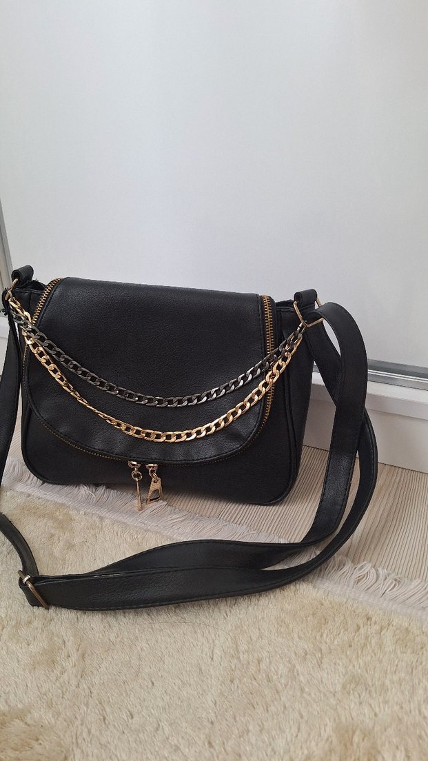 1 kere takıldı hiçbir defosu yok. Zincir detaylı, parlak siyah deri kadın çanta.