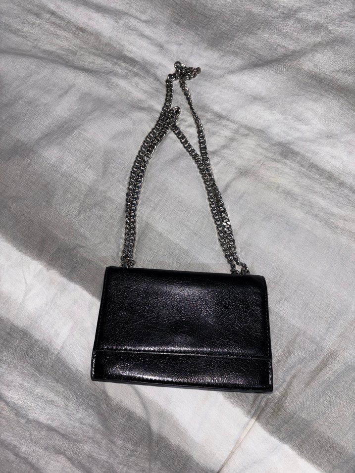 Zincir detaylı siyah deri kadın çantası, minimalist ve sokak tarzına uygun, gündelik kullanım için idealdir. Düz yüzeye sahiptir.