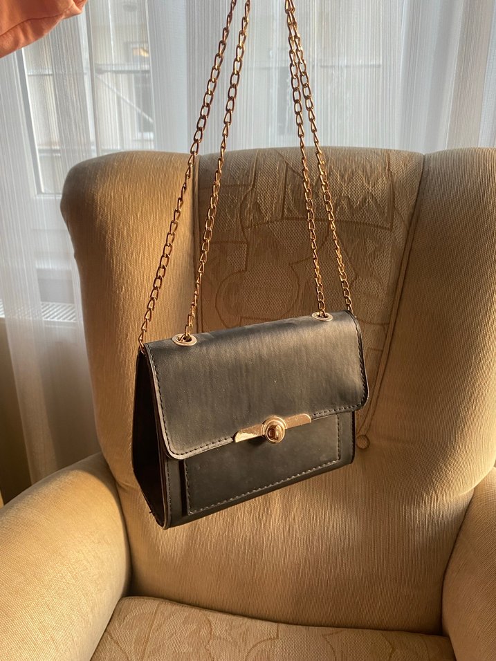 Zincir detaylı, parlak siyah deri kadın çantası, minimalist ve klasik şıklığı günlük kullanım için sunuyor.