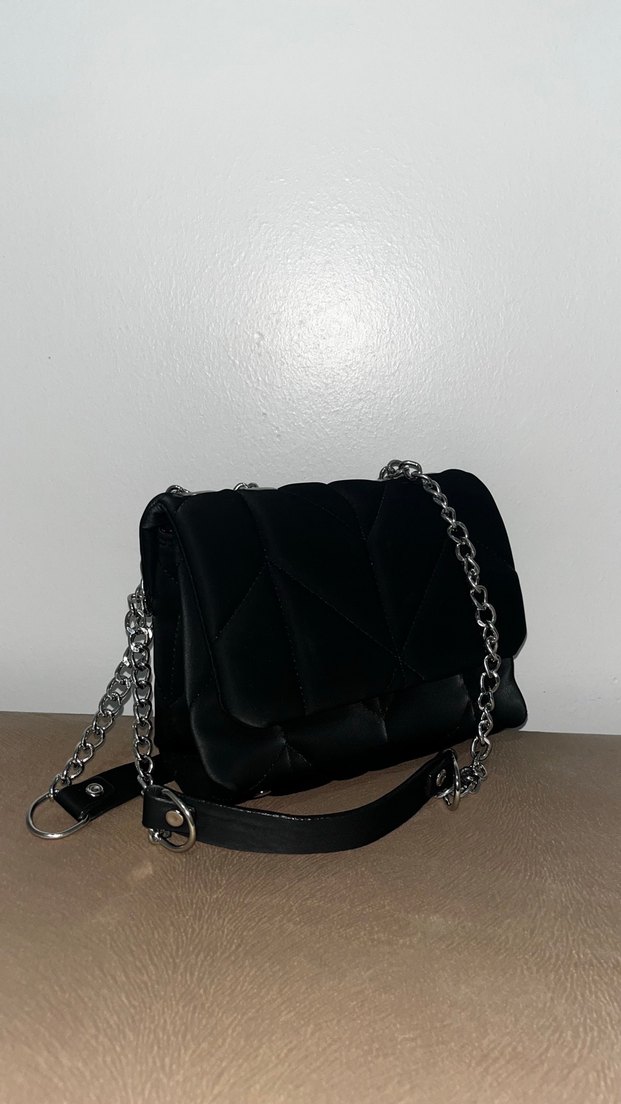 0 kullanım - Zincir detaylı siyah deri kadın çanta, minimalist gotik tarzı ve trend günlük kullanıma uygundur.