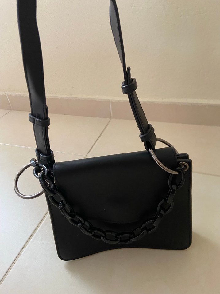Siyah deri, zincir detaylı kadın çantası. Minimalist gotik tarzıyla günlük kullanıma uygun, şık ve modern bir tasarım.