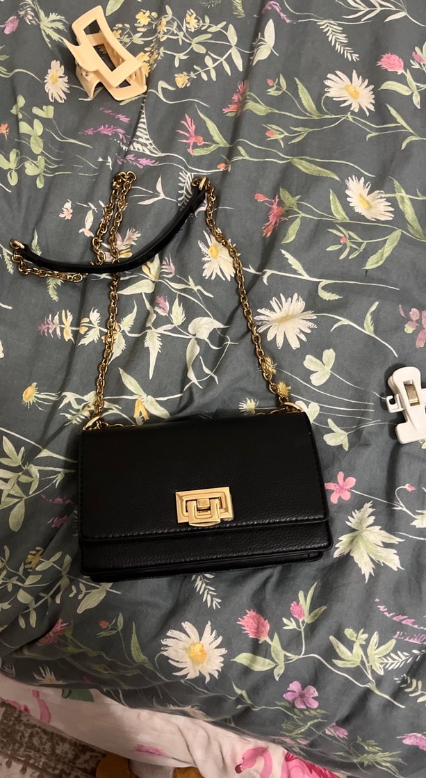 Zincir detaylı siyah deri kadın çanta, baskılı desene sahip. Trendy casual street wear için uygun, günlük kullanıma ideal.