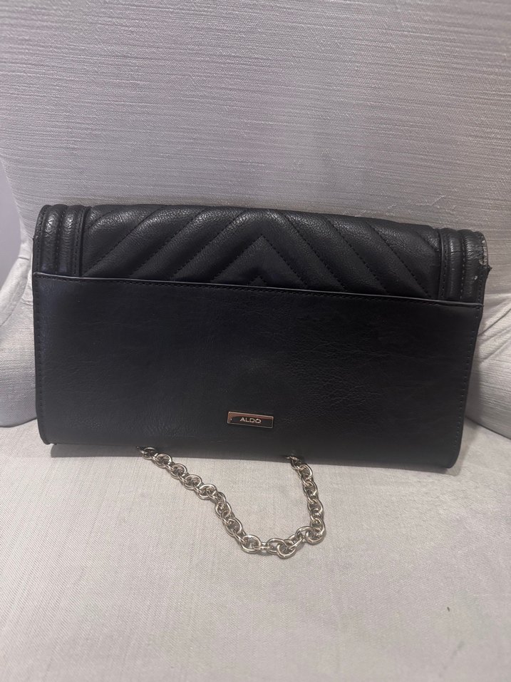 Zincir detaylı siyah suni deri kadın çanta, modern klasik tasarıma sahip, romantik akşamlar için uygun, desen içermeyen şık bir modeldir. Aldo markasından alınmış az kullanılsada dolapta deride dökülmeler oluşmuş