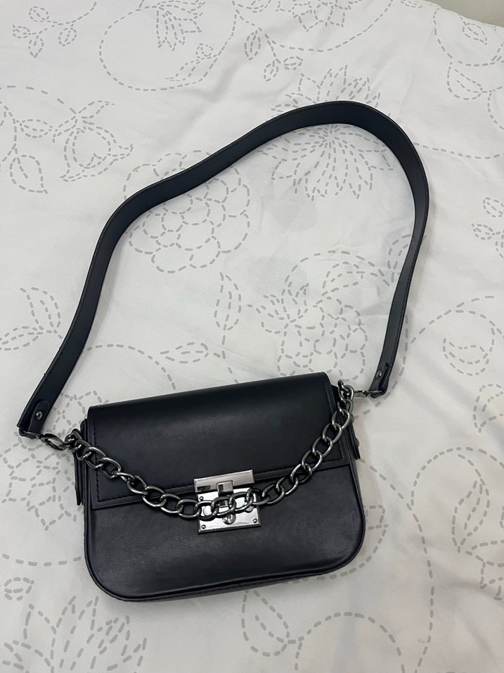 Zincir detaylı ve gümüş renkli tokalı siyah deri kadın çanta.