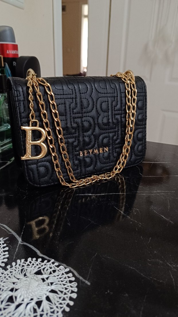 Siyah deri kadın çanta, baskılı desen ve parlak altın zincir detaylara sahiptir. Beymen logosu ve "B" harfi aksesuarı bulunur. Cesur sokak stili ve iş kullanımına uygundur. Yırtık dökülme yok.