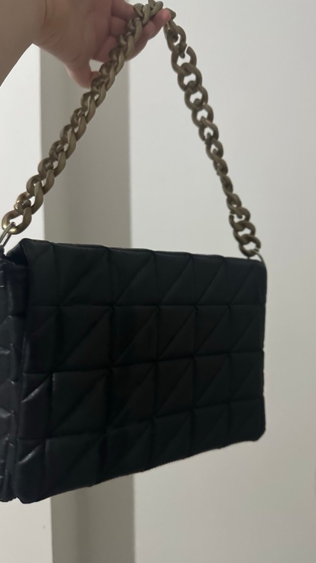 Zincir detaylı, kapitone desenli siyah deri kadın çanta, günlük kullanıma uygun şık bir sokak stili tasarımı sunar.