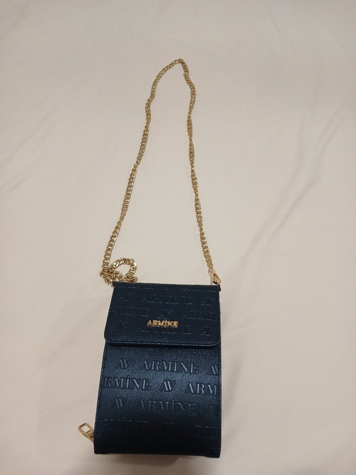 Siyah deri çapraz çanta, baskılı desen ve altın renk zincir detaylı. Üzerinde 'ARMINE' marka yazısı kabartmalı. Günlük kullanım için uygun, trend sokak stiliyle uyumlu.