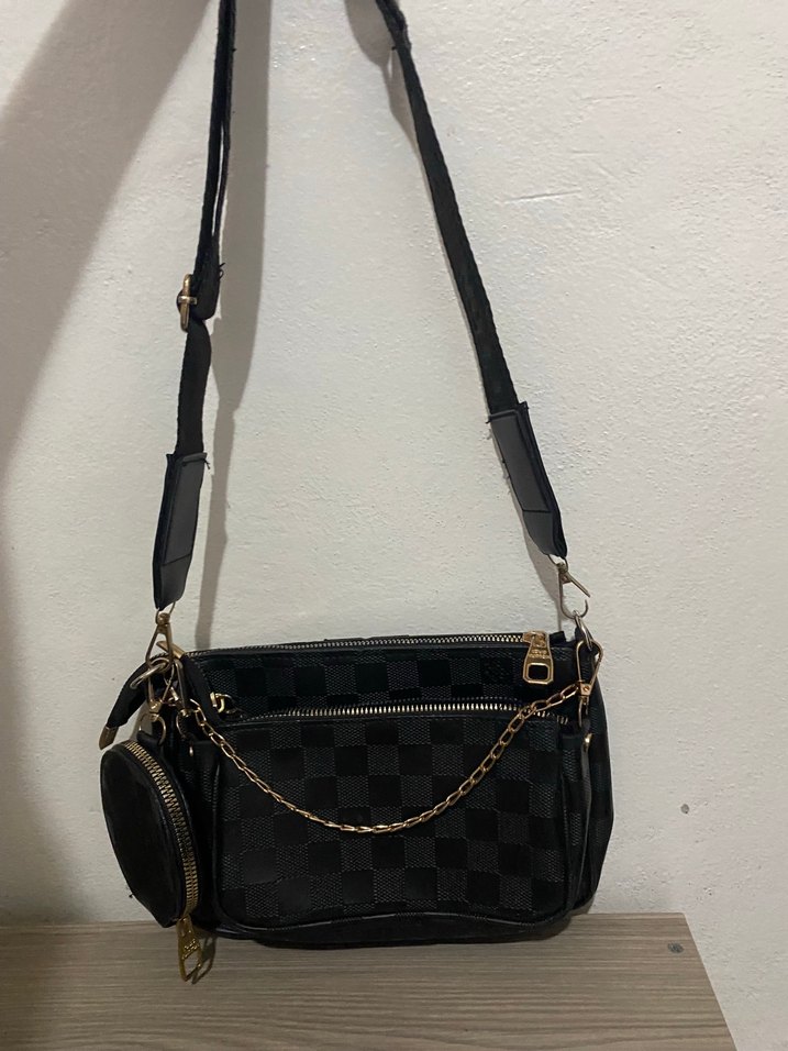 Siyah deri, kare desenli kadın çapraz çanta. Zincir detaylı, ayarlanabilir askılı ve çoklu fermuarlı ön bölmelidir. Bölmeler çıkarıp takılabilir