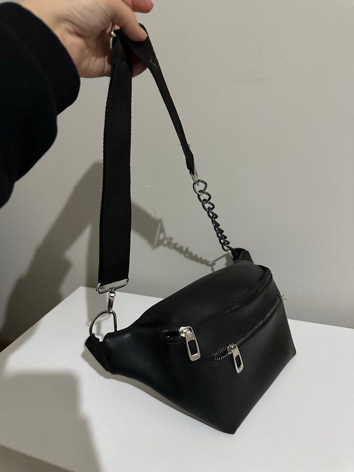 Zincir detaylı siyah deri çapraz çanta, çoklu fermuarlı bölmelerle günlük sokak stili için uygundur.
