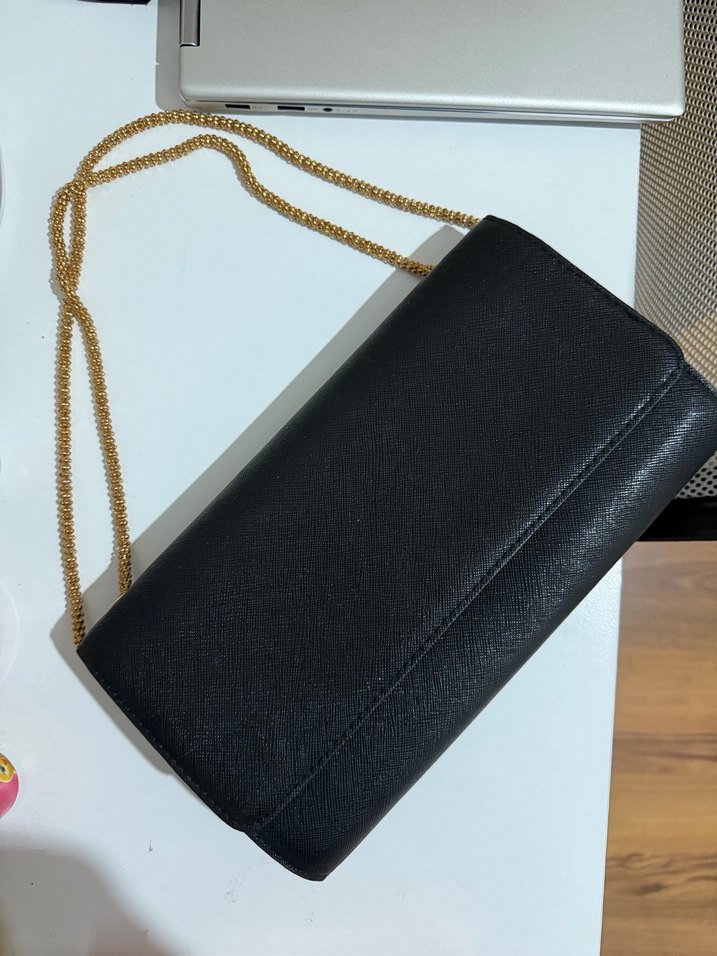 Siyah deri kadın clutch çanta, zincir detaylı ve desen içermeyen minimalist tasarıma sahiptir. Klasik zarafet ve modern klasik stil sunar, günlük kullanım için uygundur.