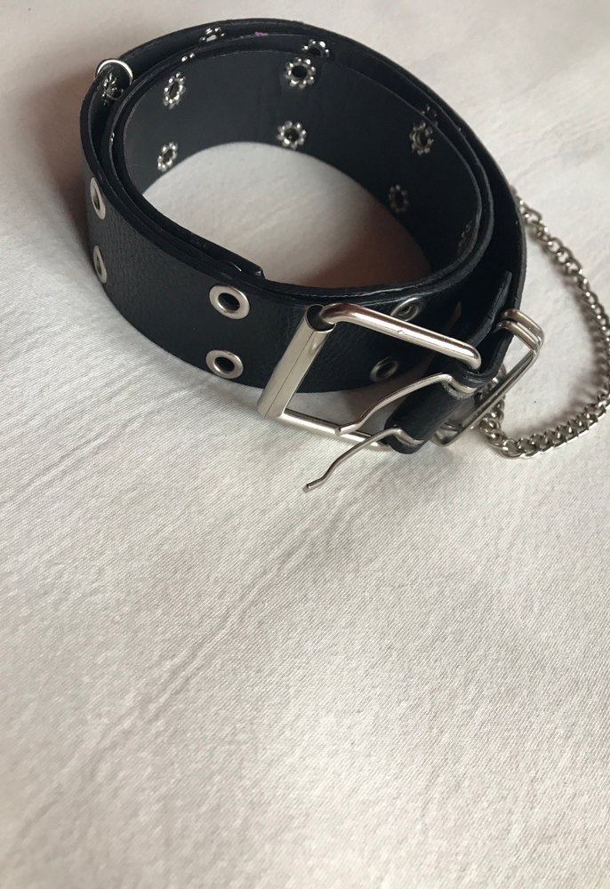 Zincir detaylı ve metal zımbalı siyah deri kemer, rock punk ve grunge tarzını yansıtıyor.