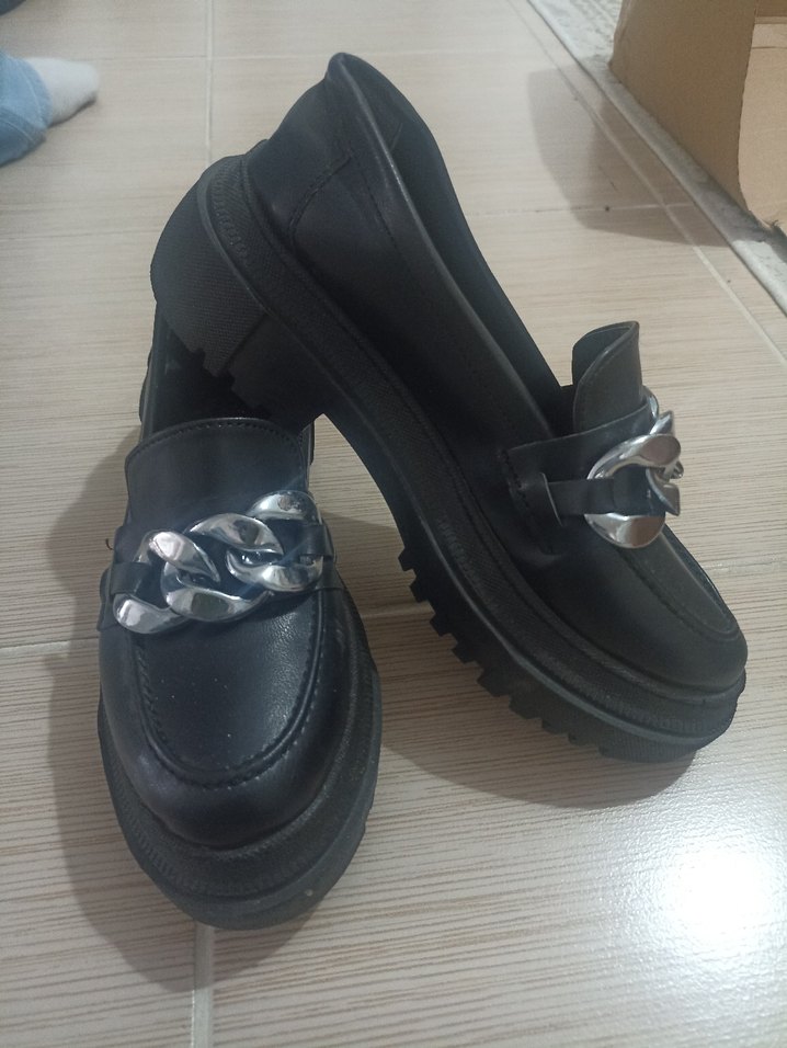 Gri yılan derisi desenli, blok topuklu siyah deri kadın loafer ayakkabı, zincir detaylı. Günlük sokak tarzına uygun. 37numara