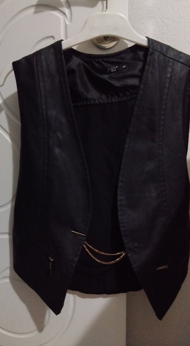Zincir detaylı, kesimli yakalı siyah deri yelek, günlük kullanıma uygun gotik tarzda, şık ve trend görünümlü.