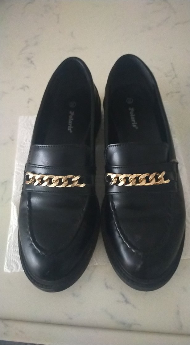 siyah deri loafer, parlak altın zincir detayıyla trendy casual goth tarzını yansıtıyor. Desensiz, şık bir görünüme sahip.