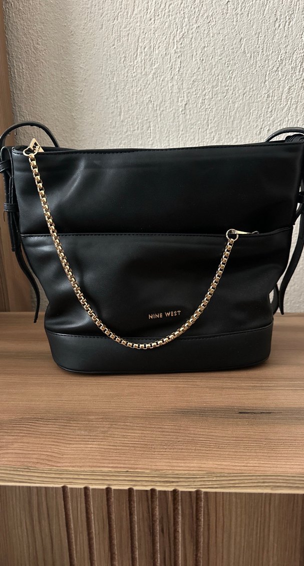 Parlak siyah deri Nine West çanta, zincir detaylı ve desen içermeyen minimalist tasarıma sahip, klasik şıklık ve günlük kullanım için uygundur.