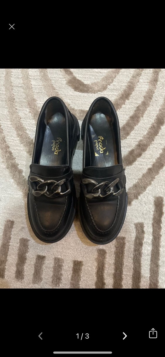 Zincir Detaylı Siyah Deri Topuklu Kadın Loafer