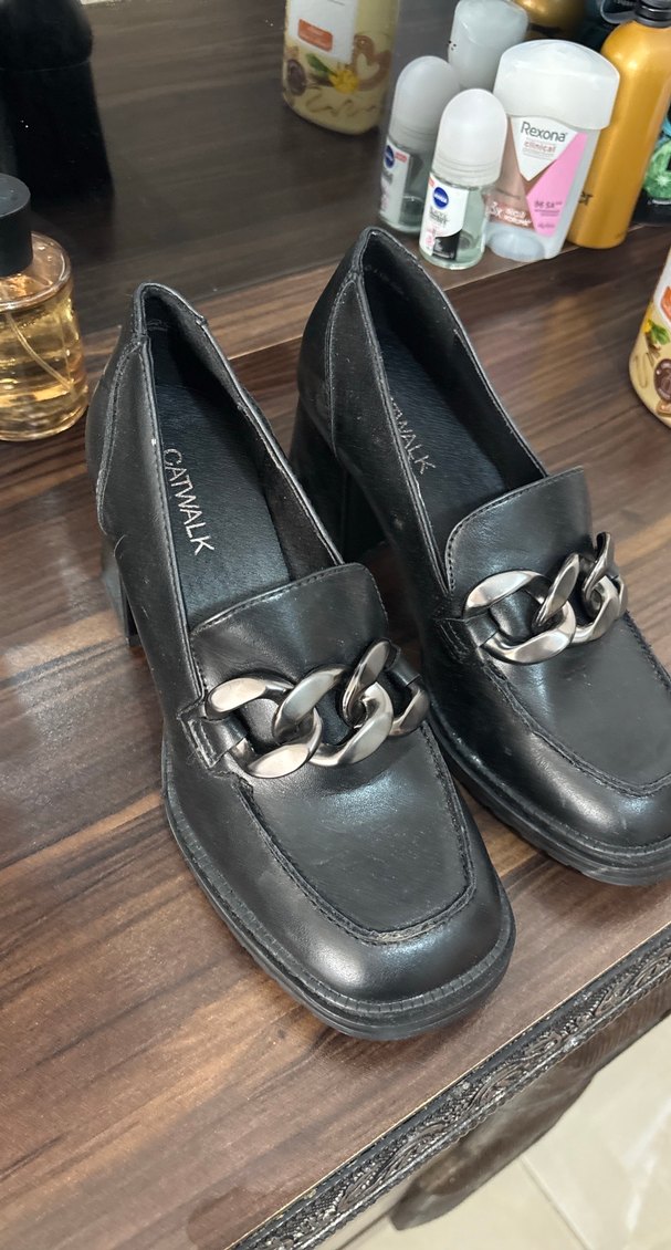Siyah deri, zincir detaylı kadın loafer. Klasik yılan deseni ve blok topuklu, CATWALK markalı.