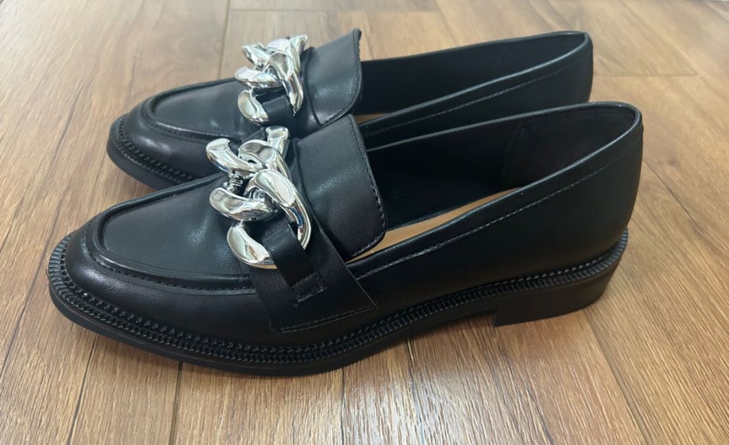 Zincir Detaylı Siyah Deri Topuklu Loafer