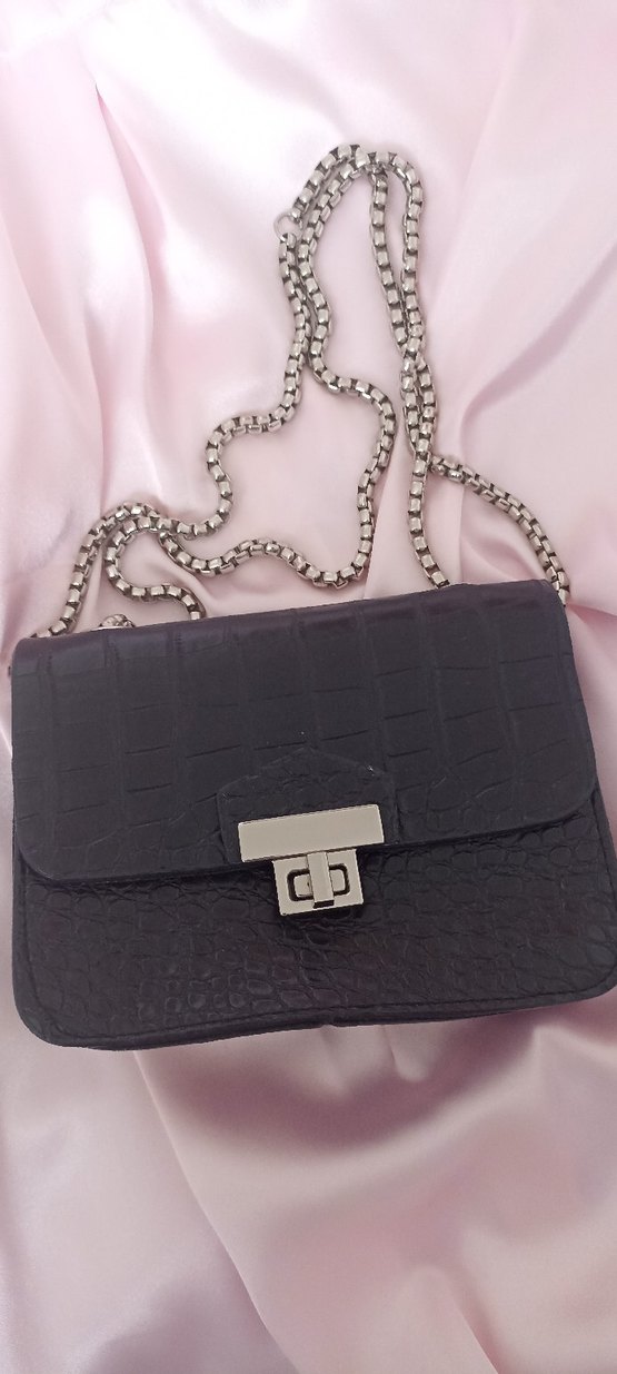 Zincir Detaylı Siyah Deri Yılan Desenli Çanta