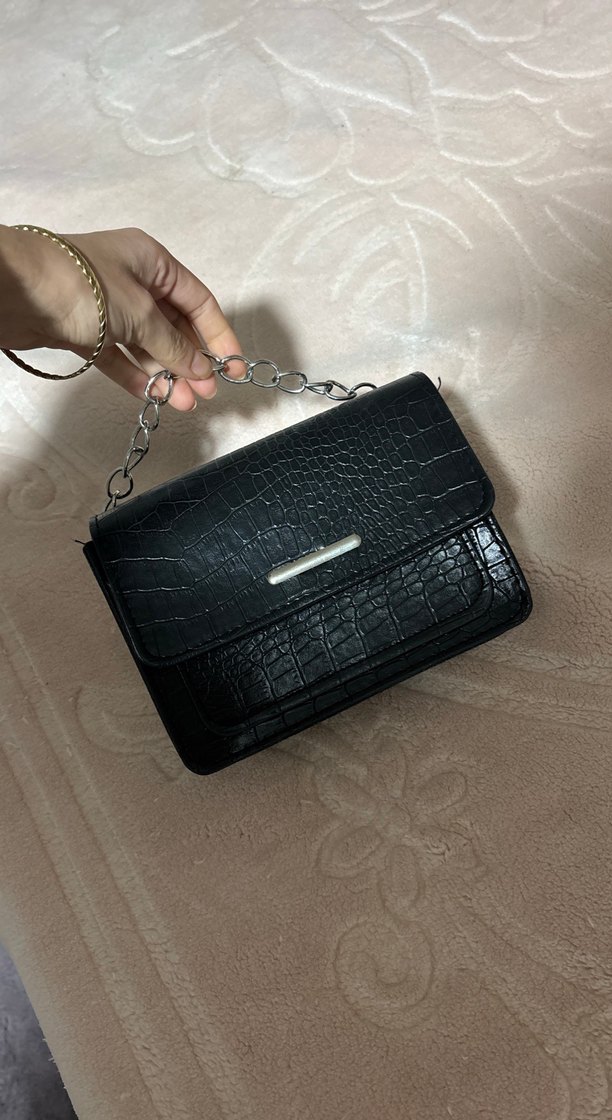 Zincir detaylı, yılan desenli siyah deri çanta, günlük kullanıma ve sokak stiline uygun.