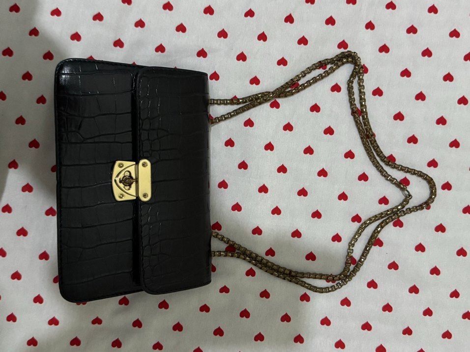 Zincir askılı, yılan desenli siyah deri kadın çantası.Zincir renklerinde hafif solma var sadece.Altın renkli kilit detaylı, gotik Paris tarzında klasik şıklık sunar. Romantik akşamlar için ideal.