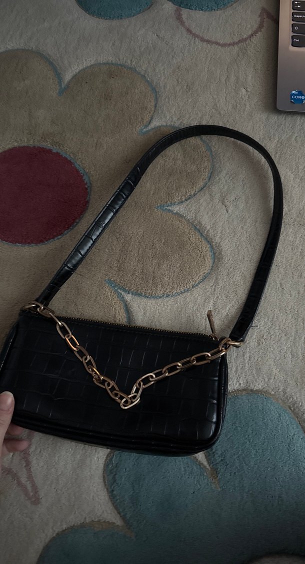 Zincir Detaylı Siyah Deri Yılan Desenli Çanta PULL AND BEAR