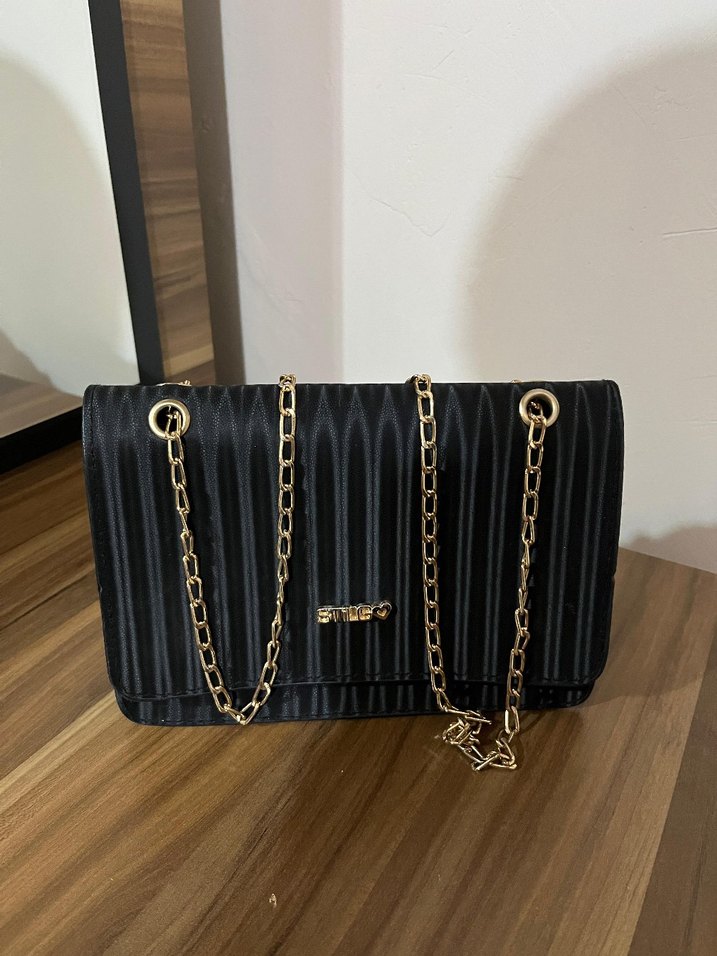Siyah desenli, parlak görünümlü kadın çantası. Sentetik kumaştan ve zincir detaylı, modern klasik Günlük kullanıma uygundur.