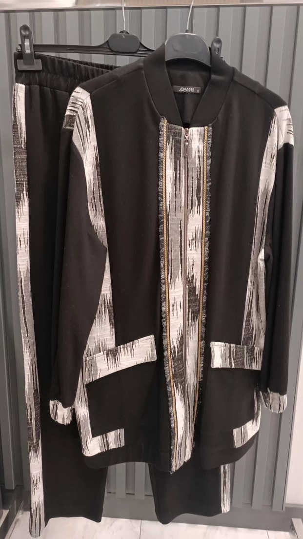 Kadın takımı, uzun kesim ve regular fit olup, kesik yakalıdır. Sentetik kumaştan yapılmış, zincir detayları ve siyah-beyaz desenleriyle ofis için uygundur. 1 ve 2 bedeni mevcuttur 38-48 arasidir