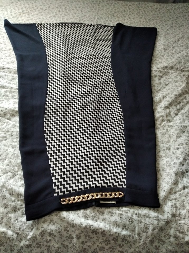 Sentetik kumaştan, siyah ve desenli uzun, etek. Etek ucunda zincir detayı bulunur. Sokak modasına uygun avant-garde tarzda.