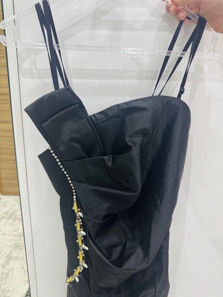 Dar kesim siyah uzun elbise, ince askılı straplez yaka ve zincir detaylarıyla avant-gardetarzda, mezuniyet, parti için uygun.