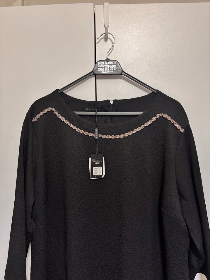 Zincir detaylı yuvarlak yaka siyah yarım kollu elbise, bol kesimdir. Sentetik kumaştan, nakışlı desenlerle minimalist sokak stili sunar. Hiç giyilmedi, etiketi üzerinde Boy:106 cm İki kol arası genişlik: 65 cm