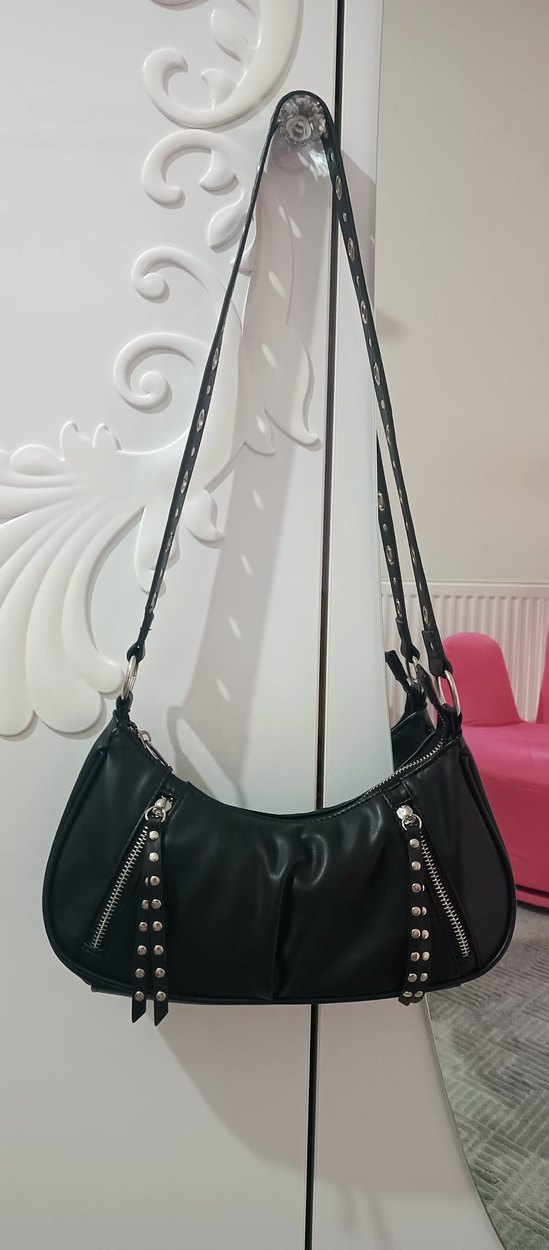 Zincir ve perçin detaylı siyah deri kadın çanta, fermuar aksanlı. Günlük kullanıma uygun gotik tarzda.