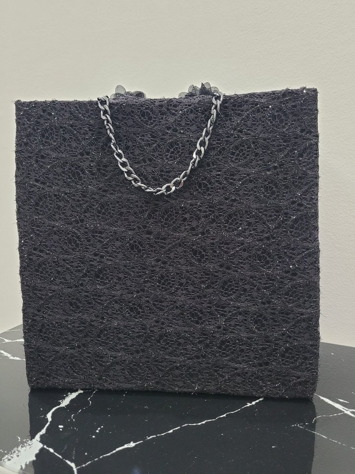 Zincir detaylı, dokulu sentetik kumaştan yapılmış, iç kumaşı keçe siyah gotik tarzda kadın çanta. Günlük kullanıma uygun. Oturmalarıniza şıklık katacak ayakkabı çantası