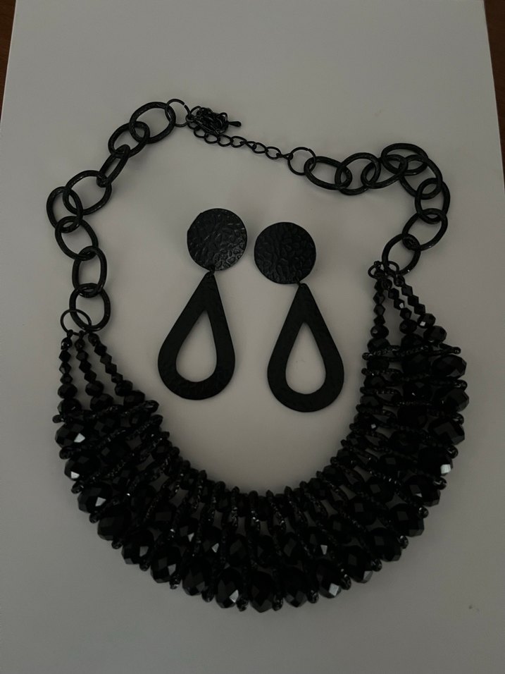 Kısa uzunlukta, zincir detaylı siyah gotik kolye seti ve uyumlu küpeler, modaya uygun öncü kadınlar için ideal.