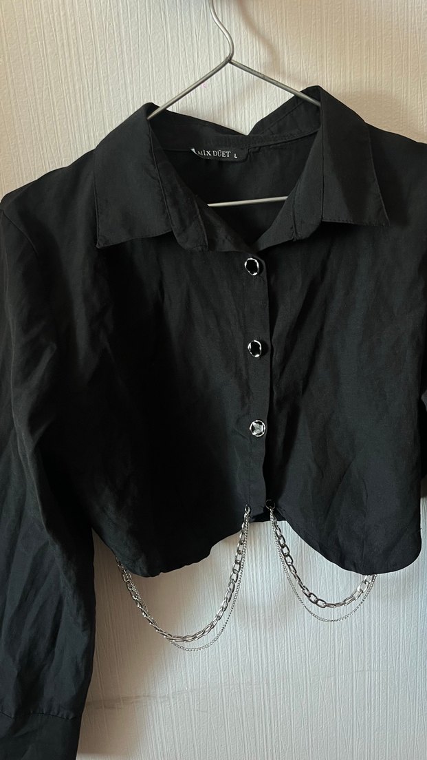 Siyah keten kumaştan, zincir detaylı, yakalı ve askılı kollu, fitted kesim gotik gömlek. Parlak dokusu ile dikkat çeker.