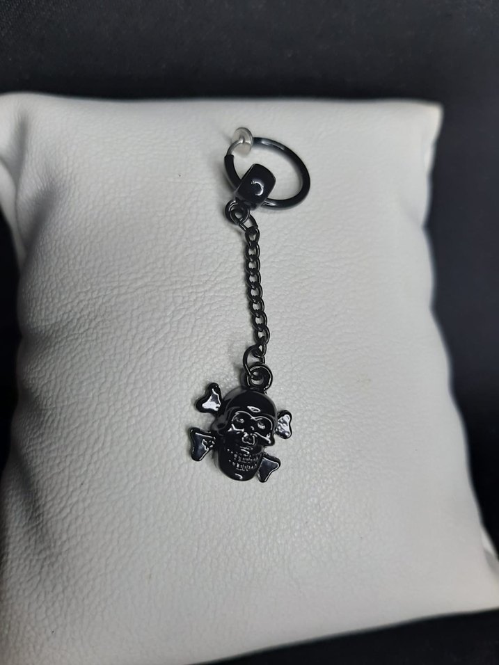 Gotik ve punk rock tarzını yansıtan, zincir detaylı siyah kurukafa ve çapraz kemik desenli çelik küpe