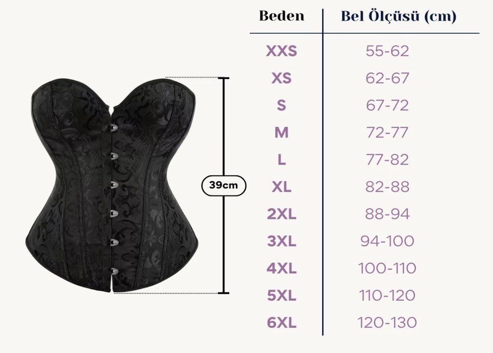 Zincir detaylı, straplez yaka ve baskılı gotik tarzda siyah bustiyer. İpek gibi kumaştan, vücuda oturan kesim ve midi uzunlukta. XXS'den 6XL'e kadar bedenler.