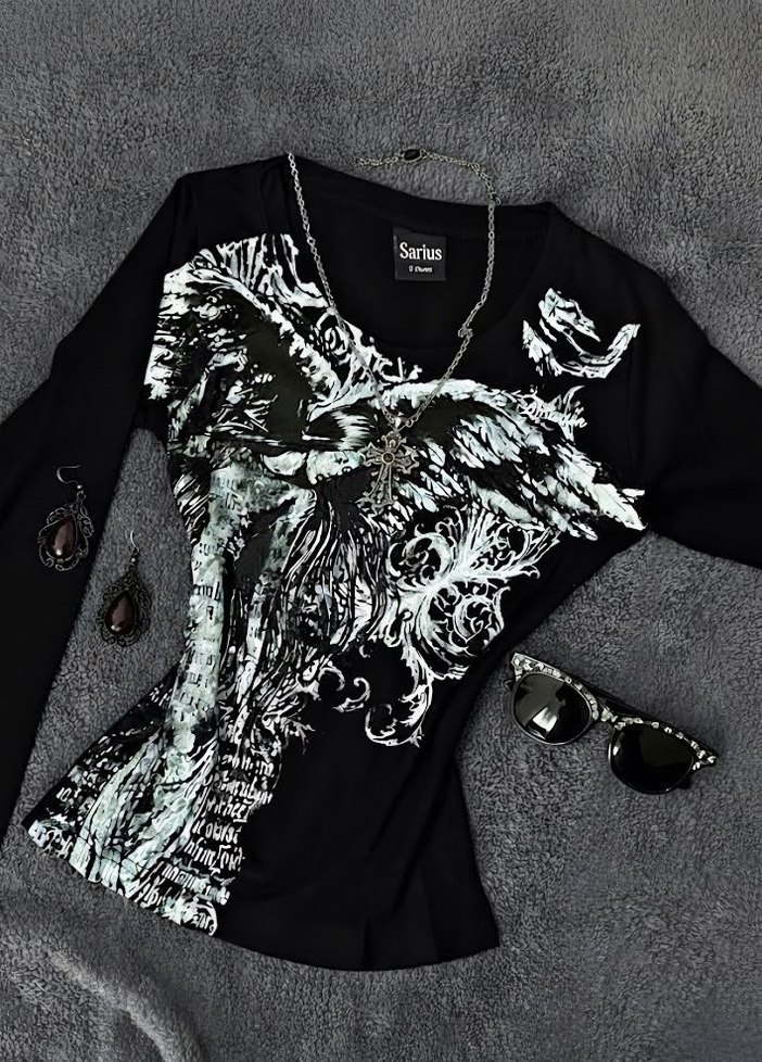 Dar kesim, uzun kollu siyah bluz, gotik desenli ve zincir detaylı V yakaya sahiptir, sentetik kumaştan üretilmiştir.
